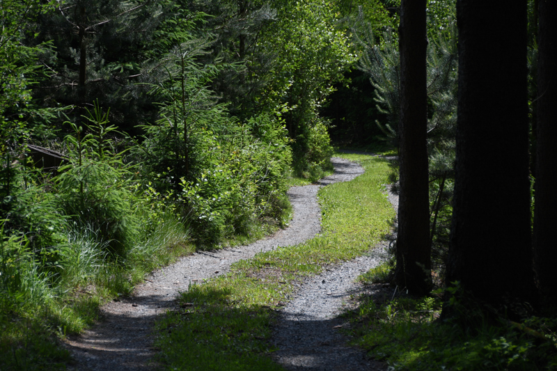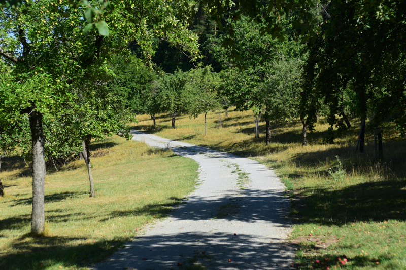 Kapelle führt ein Wiesenweg abwärts in das Waldtal des Großen