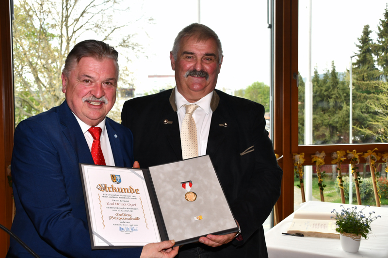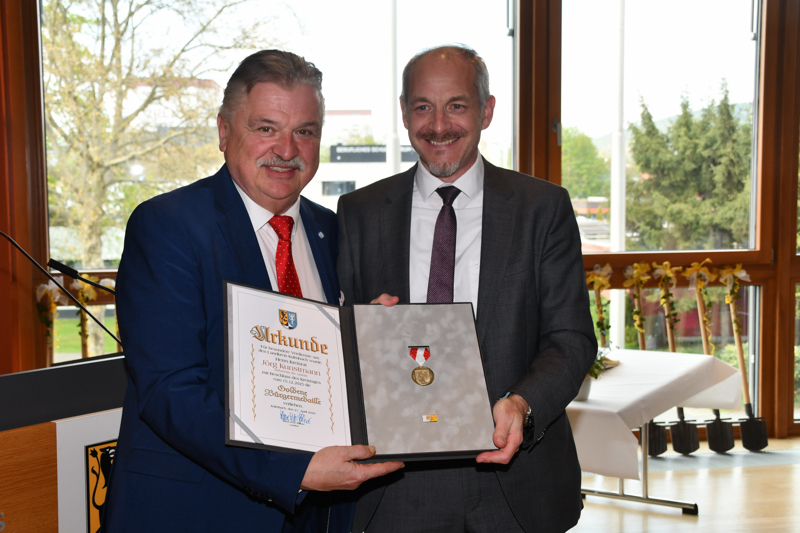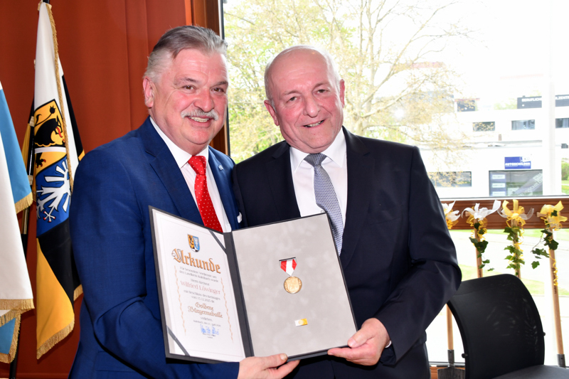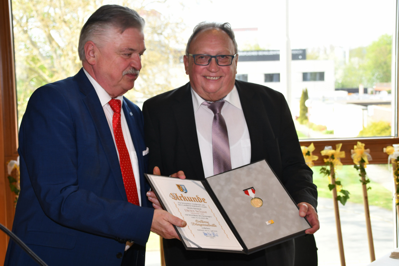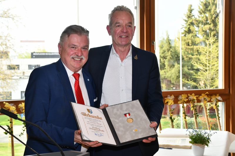 In insgesamt neun Ansprachen würdigten prominente Persönlichkeiten in der Stadthalle das Wirken von Michael Hohl. Von außerordentlichem Engagement war dabei die Rede, von Herzblut und brennender Leidenschaft für Bayreuth sowie von Bescheidenheit und Aufrichtigkeit. Ganz unkonventionell hatte zuvor Radiomoderator Christian Höreth die Würdigung Hohls auf den Punkt gebracht: „Er hat sechs Jahre lang die Knochen hingehalten, für Bayreuth viele Tore geschossen und ist dabei immer ein fairer Sportsmann geblieben“, sagte Höreth. Mit der Bayreuth-Medaille in Gold und einem Eintrag in das Goldene Buch der Stadt zeichnete der zweite Bürgermeister Thomas Ebersberger (CSU) das bisherige Stadtoberhaupt aus. Er zählte eine ganze Reihe von Wegmarken und zukunftsweisende Vorhaben der sechsjährigen Amtszeit Hohls auf, konnte sich einen Seitenhieb gegen die Presse allerdings nicht verkneifen. Vereinzelte Journalisten seien während des Wahlkampfs als Stimmungsmacher in den Vordergrund getreten und hätten die Stimmung nachhaltig beeinflusst, sagte Ebersberger. Anders der Bayreuther Landrat Hermann Hübner (ebenfalls CSU): „Demokratie heißt Vergabe politischer Ämter auf Zeit, daran sollten wir alle denken“, sagte Hübner. Als originelles Abschiedsgeschenk überreichte der Landrat dem im Rheinland geborenen Hohl einen rheinischen Weinstock. Zuvor hatte er Hohl unter anderem als jemanden beschrieben, der vor allem für Verlässlichkeit steht: „Er ist jemand, mit dem ich jede riskante Bergtour machen würde“, sagte Hübner. Ähnlich wie bei einem Zapfenstreich durfte sich Michael Hohl zu seinem Abschied auch die Musik selbst aussuchen. Neben dem Wach-auf-Chor aus Richard Wagners Meistersingern von Nürnberg und einer witzig interpretierten Version von Gioachino Rossinis Ouvertüre zu der Oper „Der Barbier von Sevilla“, aufgeführt vom Kammerchor des Markgräfin-Wilhelmine-Gymnasiums hatte sich der Rhythm-and-Blues- und Soul-Fan Michael Hohl die Bayreuther Band „Huebnotix“ gewünscht. Die vier Musiker gaben unter anderem Songs von Peter Gabriel, der Band Coldplay und der Blues-Brothers zum Besten. Weitere Grußworte zum Abschied sprachen Vertreter aus Bayreuths Partnerstädten und –regionen La Spezia (Italien), Rudolstadt (Thüringen), Tekirdag (Türkei), dem 6. Prager Stadtbezirk, und der Burgenländischen Landesregierung (Österreich). Bereits am kommenden Donnerstag soll Hohls Nachfolgerin Brigitte Merk-Erbe bei einer Festsitzung des Stadtrates vereidigt werden. Die Sonderschulkonrektorin hatte die Stichwahl vor exakt vier Wochen mit knapp 53 Prozent der Stimmen für sich entschieden. Bild: Bayreuths Zweiter Bürgermeister Thomas Ebersberger zeichnete den bisherigen Oberbürgermeister Michael Hohl zum Abschied mit der Bayreuth-Medaille in Gold aus.
