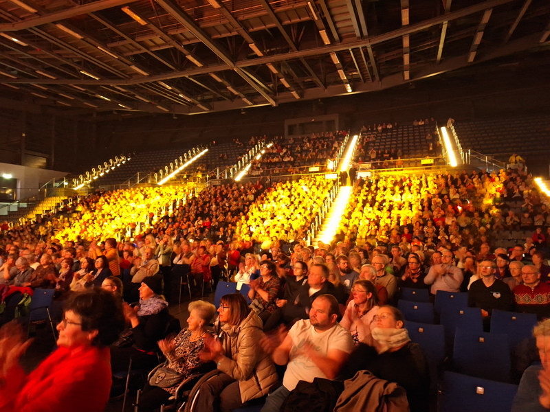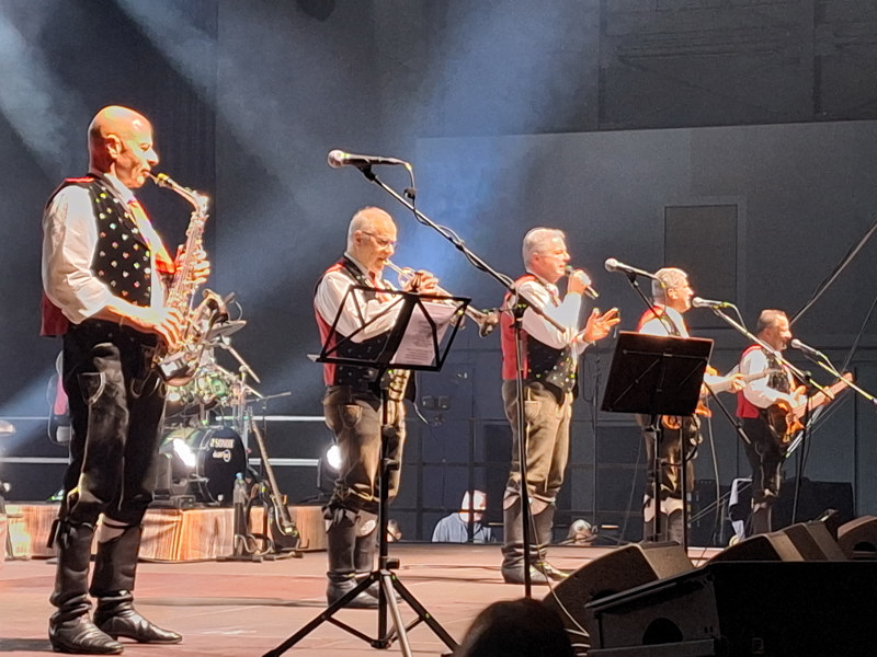 „Lebe jetzt“ heißt das aktuelle Album von Karl-Heinz und Bernd. Daraus stammten auch die meisten Songs, die beide in der Freiheitshalle performen. Bernd und Karl-Heinz Ulrich besangen zunächst den „Sommer 65“. Weiter ging es nach Ägypten zum „Pharao“, die Amigos fühlen sich „Wie die Rolling Stones“ und dann wird wieder in „Petticoat und Rock ‘n Roll“ getanzt. Bernd tanzt allerdings nicht mit. Ab und zu muss er sich setzen, denn er leidet unter zwei angerissenen Bändern, wie er ziemlich zu Beginn verkündet. Der Stimmung tut das aber keinen Abbruch.