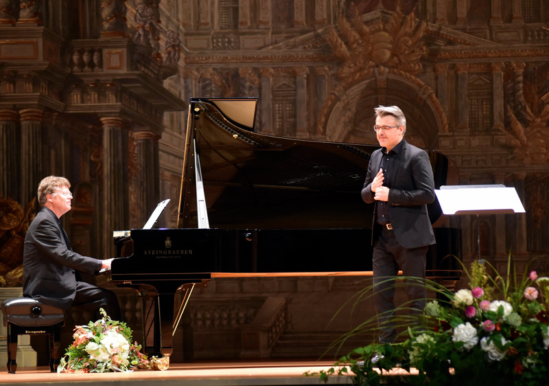 Ganz andere Musik dann mit Arnold Schönbergs Streichsextett „Verklärte Nacht“, interpretiert von Konradin Seitzer und Stanco Madic (Violine), Luke Turrell und Alexander Petersen (Viola) sowie Arthur Hornig und Tatjana Uhde (Cello). Die Musiker zeigen sich gut aufeinander abgestimmt, spielen kontrastreich, aber nie übertrieben virtuos. „Verklärte Nacht“ ist das erste offizielle Kammermusikwerk Arnold Schönbergs, es stammt aus dem Jahr 1899. Zumindest zeitlich ist es damit gar nicht so weit weg, von Liszt und Wagner und klanglich blitzt wieder der „Tristan“-Akkord auf, kein Wunder, geht es doch um so etwas wie um Erlösung durch Liebe. Das konnte man gleich zu Beginn erfahren, als Konradin Seitzer das zu Grunde liegende Gedicht von Richard Dehmel rezitierte. Die Komposition ist bereits von der schillernden Luft des Fin de siècle durchzogen und verfehlt damit ihre meditative, transzendente und narkotische Wirkung nicht. Dazu passen wiederum die Lieder von Claude Debussy sehr gut. „En sourdine“ aus den „Fêtes galantes“, „La Chevelure“ aus den „Chansons de Bilitis“ und „Nuit d’étoiles“. Debussys Klänge sind, interpretiert von Christa Mayer und Jobst Schneiderat, wie ein Ausflug in eine andere Welt. Nicht nur purer Schönklang, sondern auch musikalische Intensität, unverkrampft und offenherzig. Warm und glänzend timbriert erklingt der schmelzende Mezzo von Christa Mayer. Charmant und grazil trifft sie die Atmosphäre dieser Gesänge, die eine ganz spezielle Tonsprache entfalten. Auch hier erweist sich Jobst Schneiderat am Flügel wieder als idealer und versierter Liedbegleiter, der in der Lage ist, eigene Akzente zu setzen. Mit der Komposition „Golliwog’s Cakewalk“ aus Claude Debussys „Children‘ s Corner“ hat er zudem die Gelegenheit seine eindrucksvolle Spieltechnik einmal solistisch unter Beweis zu stellen. Nicht nur hier ist sein Spiel überaus brillant, von bestechender Klarheit und Transparenz. Als Überraschung hatten die vier Hornisten des Festspielorchesters zuvor von der Terrasse der Schlosskirche aus auf dass Konzert eingestimmt. David Brox, Quirin Rast, Thomas Sonnen und Markus Wittgen führten im Vorfeld Hornquartette unter anderem von Richard Wagner und Carl Maria von Weber auf. Bilder: Das alles steckt im „Tristan“-Akkord / Pianist Vincent Julien Piot bei der Gesellschaft der Freunde von Bayreuth